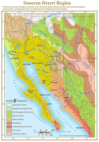 - Dimmitt, M.A. Biomes and Communities of the Sonoran Desert Region. In A Natural History of the Sonoran Desert, 2nd ed.; Dimmitt, M.A., Comus, P., Brewer, L., Eds.; Arizona-Sonora Desert Museum Press: Tucson, AZ, USA, 2015; pp. 5–19. [Google Scholar]