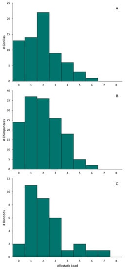 Distribution of allostatic load scores in zoo-housed (A) western lowland gorillas, (B) chimpanzees, and (C) bonobos.