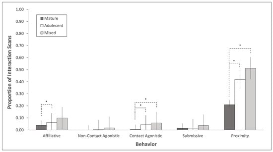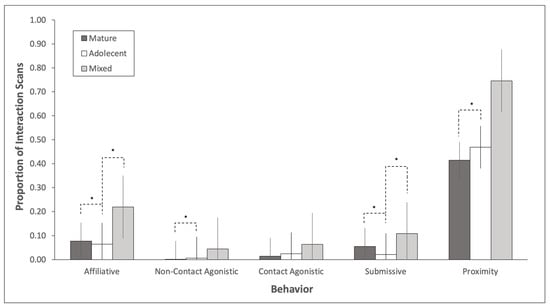 Proportion of scans when an adolescent focal animal engaged in social behaviors in different social groups. Adolescent bulls engaged in significantly more affiliative and submissive behaviors in mixed-age and mature groups compared to with only other adolescents. Adolescent bulls also exhibited significantly less non-contact agonistic behaviors and spent significantly less time in proximity to a conspecific when they were housed with mixed-age groups compared to when they were with only other adolescents. Mature = adolescent focal animal housed with group including only bulls who regularly undergo musth; Adolescent = adolescent focal animal housed with group including only other bulls who do not regularly undergo musth; Mixed = adolescent focal animal housed with group including both bulls who do and do not regularly undergo musth. * indicates p < 0.05.