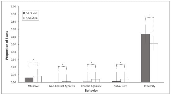 Proportion of scans when a focal animal engaged in social behaviors in different social groups. Bulls housed in new social groups engaged in significantly more affiliative behavior, more agonism (both non-contact and contact), and more submissive behaviors than when they were in established social groups. Despite the increase in some social behaviors, bulls spent significantly less time in proximity to a conspecific in new social groups compared to established social groups. Est. Social = social groups that were housed together prior to this study, both at Denver Zoo and at Individual 4 and 5′s previous institution. New Social = social groups introduced during this study, beginning in February 2019. * indicates p < 0.05.