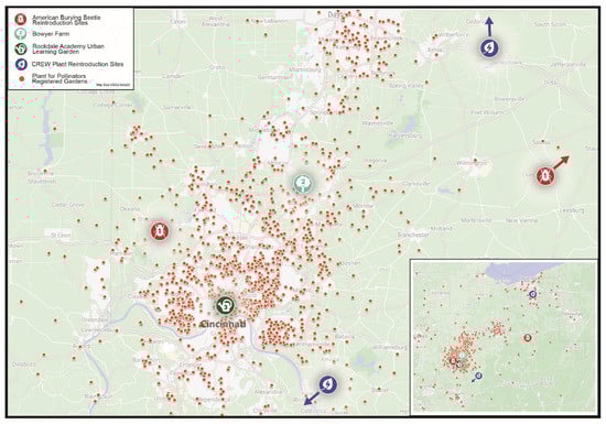 Plant restoration can create welcoming landscapes for wildlife [,,]. For example, diverse plants in urban gardens have a strong, positive influence on insect populations [,,,,]. Insect conservation programs recommend a diversity of native plant species to increase viable landscapes [,,,,]. Community members in residential areas, no matter if they have a sprawling area in their yard or just a few flowerpots, can have a positive impact on insect populations []. With more diverse green spaces and corridors, cities can provide vital refuges for wildlife [].