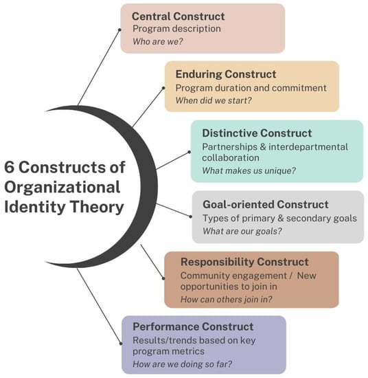 Organizational identity theory (OIT) [] provided the framework for the evaluation in this study. OIT outlines components of an organization’s strategic plans across six constructs to enable constructive evaluation. From the foundations of identities and desired outcomes to the application of intentions into active projects and invitations for stakeholders to join in, the six constructs highlight connections between abstract aspirations and their application on the ground []. (1) The central construct defines the core features and missions of an organization. (2) The enduring construct explores how long an identity has endured, and even strengthened, over time to understand how an organization has prioritized this identity over other possible strategies []. (3) The distinctive construct highlights what makes an organization and its activities unique. (4) The goal-oriented construct assesses whether the organization set deliberate intentions as important precursors to organization’s decision-making for future activities []. (5) The responsibility construct examines how an organization creates legitimacy when it influences its stakeholders toward acting in support of its mission []. (6) The performance construct facilitates the formative evaluation of current performance against the organization’s goals to promote reflection on opportunities for improvement [].