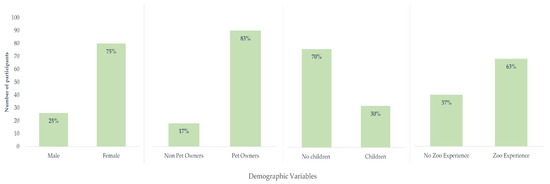 - Alba, A.C.; Ferrie, G.M.; Schook, M.W.; Leahy, M.; Cronin, K.A. Gender and Age, but Not Visual Context, Impact Wildlife Attitudes and Perceptions of Animals in Zoos. J. Zoo. Bot. Gard. 2023, 4, 118–133. [Google Scholar] [CrossRef]