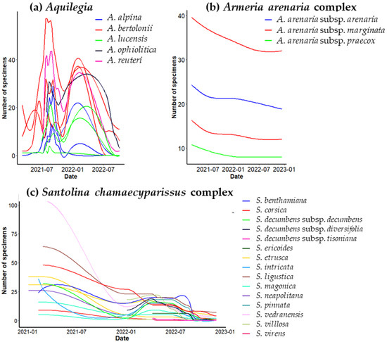 Cultivation trends at the Botanic Garden and Museum expressed by the number of individuals in cultivation (y-axis) over time (x-axis). Each line corresponds to a single accession, while taxa are represented by different colors. An increase in the curve means that new material arrived from the PLANTSEED Lab. Cultivation data for: (a) montane Aquilegia from N Apennines and W Alps, (b) Armeria arenaria complex (top line: former circumscription of A. arenaria subsp. apennina; bottom line: former circumscription of A. arenaria subsp. marginata), and (c) Santolina chamaecyparissus complex.