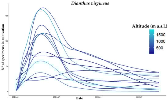 The cultivation trends at the Botanic Garden and Museum of the University of Pisa for different populations of Dianthus virgineus collected from Tuscany (Central Italy). Lines correspond to different populations (accessions), while the color expresses the altitudinal gradient (higher elevations in blue, and low elevations in red. An increase in the curve means that new material arrived from the Germplasm bank of the PLANTSEED Lab (Department of Biology, University of Pisa).