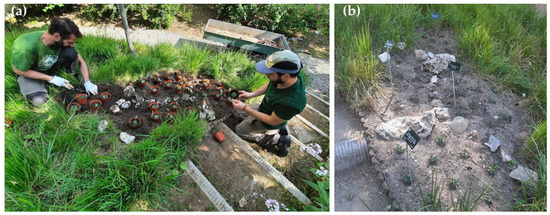 Specimens of Armeria arenaria complex prepared during the plantation phase at the Botanic Garden and Museum of the University of Pisa (a) and the labeled plants later displayed to the public (b).