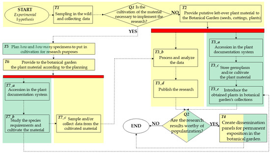 The workflow is composed of queries and tasks, performed either by one institution or by both. The start point originates from a given experimental hypothesis, ending with different outputs depending on the specific case. From the workflow, several emerging properties arise for both the institutions involved, as well operational advantages. Indeed, a prolific intellectual environment where new ideas arise from the interaction of different skills, attitudes, and points of view (according to the peculiarities of PLANTSEED and BGM-PI, respectively) is created, boosting the process from the experimental hypothesis up to the expected outcomes (scientific research publishing, conservation, and popularization). For a research-focused institution such as the PLANTSEED Lab, cooperation with a botanical garden can ensure space, facilities, and expertise to cultivate and manage the material under study (Tasks T5, T6, and T7_c; Figure 9), hence providing access to well-documented and organized specimens which are easy to sample and measure (Task T7_c; Figure 9) for the following analyses (Task T3_b; Figure 9). Again, through the user base of the botanical garden, in terms of both visitors and social networking, the PLANTSEED Lab can popularize its research activity to a vast public, thus promoting the importance of plant diversity and contribute to overcoming the so-called ‘plant blindness’ [76] in society. On the other hand, through this cooperation the BGM-PI is able to acquire rare and high-quality wild plant material, collected through appropriate scientific standards which ensure a good representation of its genetic diversity (Task T1; Figure 9). Accordingly, BGM-PI significantly fosters the implementation and the scientific value of its collections (Task T3_e; Figure 9), fulfilling its scientific institutional mission. As with the majority of small- or medium-sized botanical gardens, the staff of BGM-PI are not exclusively assigned to research tasks, so that support from a scientific institution can overcome these limitations.
