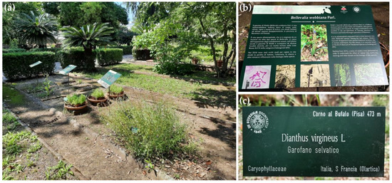 (a) A view of the collection ‘Plants in research’ at the Botanic Garden and Museum of the University of Pisa; (b) informative bilingual (Italian and English) panel about the research conducted on Bellevalia webbiana; (c) a label sample of Dianthus virgineus complex modified from the standard template, showing the population data on the top right.