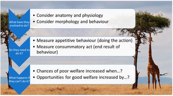 This paper examined why our understanding of a species’ ecology and evolutionary history is fundamental to evaluation of correct husbandry and care in the zoo. Observing our zoo-housed species and documenting their responses to such care can allow for welfare inferences to be made. As we move forwards with the development of best practice guidelines [] that showcase exactly what husbandry must be for any given species, we can use our knowledge of species’ responses to such a “gold standard” approach to ensure it remains current, relevant, and suitable for the species to which it is intended. By using the giraffe as a worked example, a species that is familiar in the zoo but one that still poses population management, animal care and attainment of good welfare challenges to us, this paper identified a potential way of observing behaviour, physical signs, and behavioural expression (as inferences of the mental domain of welfare) that could be used to form a validated and cross-institutional tool for giraffe welfare assessment. The seven-step W-E-L-F-A-R-E concept of identifying fundamental aspects of care for captive giraffes (things that must be met to enable animals a strong foundation for the eventual attainment of positive physical, behavioural, and psychological welfare states) can be applied across all species. This paper hopes to encourage further development of this concept by inspiring other interested parties that have the relevant expertise to objectively discuss and document what W-E-L-F-A-R-E means and looks like for each and every zoo-housed species across all taxonomic groups.