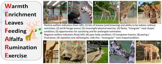 Therefore, to catalyse the development of a rapid and easy-to-apply method of reviewing giraffe welfare, which can be used quickly by zoo professionals to judge the current state of their animals, this articles examines a checklist that focuses on the mnemonic “W-E-L-F-A-R-E”. This concept was first introduced in Hickey et al. [] as a case study on determining what zoo ungulates should be provided with and is here expanded further to illustrate the application of such a stepwise guide to care and welfare. This seven-step checklist provides the evidence for a “deeper dive” welfare audit if needed, as well as a foundation for further giraffe care training and identification of key factors most likely to cause suffering in captive giraffe. Working towards valid and repeatable assessment of the mental domain is important yet challenging. But this challenge could be simplified by first defining core ecological components and animal needs required to promote good care, good health, and species-typical behaviour, which form the basis of sound inference of positive mental states. These core components and needs are explained in Section 3.1 to illustrate where evidence is vital to support identification of good care, which leads to welfare-focussed husbandry overall.