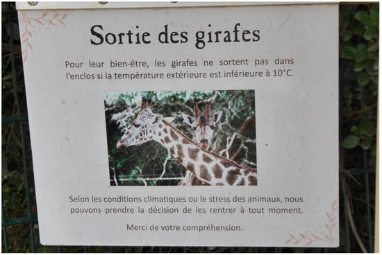 Zoos can use the application of this evidence for welfare-focussed husbandry to further engage with their visitors and explain specific aspects of animal care. For example, Figure 3 illustrates visitor interpretation at the giraffe enclosure of a large European zoo informing visitors that the animals will not be in their outside paddock if the external temperature is below 10 °C. Therefore, by using evidence to inform care, and by continuing to collect data on their giraffes’ responses to such care, zoos can be more confident in how they explain, describe, and justify husbandry practices to their visitors because they will be using methods and approaches that are in the best interest of the animals.