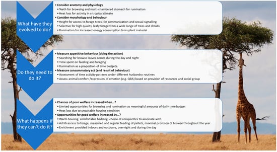 Revisiting the questions in Figure 1, we can identify why specific aspects of giraffe evolution inform our knowledge of behaviour, which should be promoted by husbandry and care routines, and provide understanding of welfare challenges when husbandry and ecology misalign (Figure 4). By evaluating each section of Figure 4, we can see that the gastrointestinal anatomy and physiology of the giraffe as a ruminant, its height and shape for losing heat are key clues to what they evolved to do and how they evolved to live. Key measures of appetitive behaviours include time spent on searching for food, across a 24 h cycle, as well as time spent on ingestion of leaves, and the proportion of time spent on rumination. Satiated giraffe can be determined by surveys of different animals under different management regimes to understand animal comfort and behavioural expression (e.g., positive aspects of behavioural expression such as calm, relaxed, and restful could link to prolonged opportunities for rumination). Animal comfort measures used in agricultural settings [,,,] could have a place in supporting the development of comfort indices of captive wild ruminant species. Finally, identification of increased chances of poor welfare because of restricted performance of appetitive behaviours but positive welfare promoted when giraffe have a wider degree of choice and control over what they can do, how, when, and with whom.