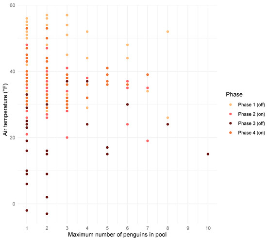 The maximum number of penguins in the pool was best predicted by the model that included only air temperature (AIC = 819.36, df = 2), even though air temperature (p = 0.12) was not significant in this model (for a full model summary, see Supplementary Materials File S2). Figure 1 illustrates that there was no relationship between the maximum number of penguins in the pool during swim bouts and air temperature across experimental phases. The average number of penguins in the pool during swim bouts was 2.42 ± 1.87 during Phase 1, 2.13 ± 1.57 during Phase 2, 2.14 ± 2.03 during Phase 3, and 2.24 ± 1.43 during Phase 4.