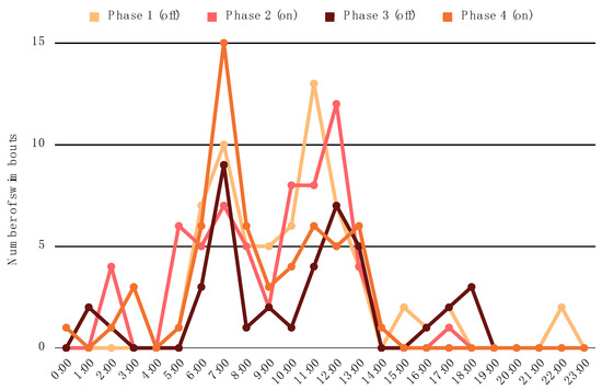 The number of swimming bouts at each hour of the day did not differ significantly between the two types of experimental phases (Kolmogorov–Smirnov test, D = 0.125, p = 0.92). Figure 2 illustrates the number of swimming bouts at each hour of the day for each experimental phase. During Phase 2 of the study, when the amount of time spent swimming was highest, the penguins spent 276 min swimming during the hours of 7:00–15:00 when the bubble curtain was turned on, and 296 min swimming during the hours of 15:00–7:00 when the bubble curtain was turned off. During Phase 4 of the study, the other phase in which the bubble curtain was on, the penguins spent 196 min swimming during the hours of 7:00–15:00 when the bubble curtain was turned on, and 64 min swimming during the hours of 15:00–7:00 when the bubble curtain was turned off.