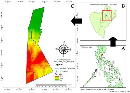 Location map of the study site in San Luis, Aurora: (A) study site pointed in the Philippine map, (B) location of the site pointed in the map of San Luis, Aurora, (C) elevation map of Barangay L. Pimentel showing the location of modified transect.