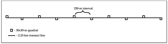 The inventory of tree species was carried out along a 2.25 km transect line with 10 30 by 30 m quadrats established at every 250 m point (Figure 2). The transect line was established following the trail while the quadrats were positioned alternately at the left and right of the transect line, with an approximate distance of 5 m away from the trail. The total coverage of all the quadrats was 9000 m2. The use of transect in conducting this plant inventory was used to ensure that the quadrats were evenly distributed throughout the forest stand [26].