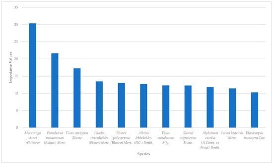 The importance values computation also revealed significant findings in terms of the species composition. Eleven (11) species had individual IVs of more than 10 (Figure 3). In total, these 11 species contributed 55.50% of the total IV of all species in the area. Among them, M. stonei had the highest IV of 30.35, which is equivalent to 10.11% of the total IV of all the species recorded, followed by Parashorea malaanonan (Blanco) Merr, with 21.63 (7.21%). M. stonei’s high IV was related to its high abundance of 24, its occurrence in six plots out of all ten plots, and a total basal area of 136.73 m2. M. stonei is Aurora province-endemic and a critically endangered plant species belonging to the family Euphorbiaceae [29,32]. This keystone species lacks focus in terms of research, thus dictating the need to study this species more and include it as one of the top priorities for conservation due to it being a species restricted to the province of Aurora.