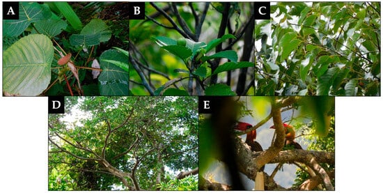 Representative photos of critically important species in the area. (A) Macaranga stonei Whitmore (endemic, IUCN critically endangered), (B) Dillenia philippinensis Rolfe (endemic, IUCN near threatened), (C) Shorea polysperma (Blanco) Merr. (endemic, DAO 2017-11 vulnerable), (D) Shorea contorta Vidal (endemic, DAO 2017-11 vulnerable), (E) a couple of Buceros hydrocorax Linnaeus (endemic, IUCN vulnerable, Philippine Red List endangered).