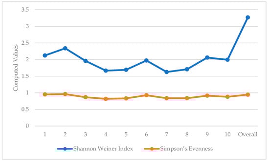 Biological diversity can be quantified using mathematical functions known as the diversity indices [39]. In this study, the widely accepted Shannon–Weiner (H’) and Simpson’s Evenness (E) were employed as the species diversity indices and computed through Paleontological Statistics (PAST v 3.18) software. The choice of these indices aligns with the standards set by previous biodiversity studies undertaken in the country and uses the Fernando Biodiversity Scale, which has been widely adopted in diverse ecological investigations in the Philippines to effectively facilitate the interpretation of computed values [40,41] (Table 1).