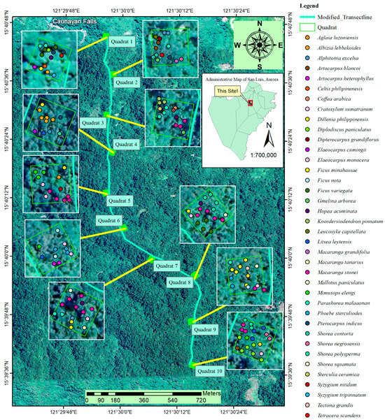Figure 7 shows the spatial distribution of trees across the sampling plots in the secondary forest of San Luis in Aurora, Philippines. This map shows the position of the transect line and the approximate location of each individual tree, represented by colored dots (legend placed on the right-hand side), based on the recorded coordinates. As observed in the map, the plots were zoomed in to show the locations of the trees more clearly. We can also see in the background of the zoomed image of the plots the actual image of the forest cover in the area, as reflected in the base map used. Mapping the spatial distribution of trees is a crucial element in devising strategies for the sustainable management and conservation of natural resources [56]. For instance, locating the trees can help us identify areas with possible sources of mother trees of the targeted species that we aim to propagate [57]. For example, if we are looking for a source of planting materials for a high-priority species such as M. stonei, which is a very important species in the area due to the fact that it is an endemic and critically endangered species, we can refer to the map and see that it can be seen in plots 3, 5, 7, 8, 9, and 10. Furthermore, distribution maps can visually present areas needing attention and immediate measures, such as in the case of our study, the presence of invasive G. arborea that poses a threat to the native biodiversity. Knowing the location of its recorded individuals (present in plots 2 and 3) will allow the forest managers to perform targeted measures in managing specific portions of the area where invasion issues arise [48]. Lastly, we can identify micro-biodiversity hotspots among the sampling plots in the study area by determining the number of critically important species [58].