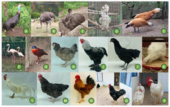 Some of the domestic and exotic bird species included in this study: (A) cassowary, (B) ostrich, (C) emu, (D) cockatoo, (E) ruddy shelducks, (F) flamingos, (G) pheasant, (H) “Araucana” breed, (I) “Brahma” breed, (J) “Ayam Cemani” breed, (K) “Japanese Silkie” breed, (L) “White Phoenix” breed, (M) “Pedrês Portuguesa” breed (Portuguese Pedrês chicken), (N) “Amarela” breed (Yellow chicken), (O) “Preta Lusitânica” breed (Lusitanian Black chicken), (P) “Branca” breed (White chicken); photo credits: João Lozano (A–G,K,O,P) and Madalena Lordelo (H–J,L–N).