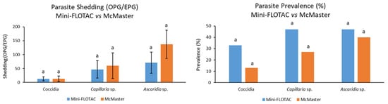 Comparison of coccidia, Capillaria sp., and Ascaridia sp. fecal shedding and prevalences between Mini-FLOTAC and McMaster methods; error bars on the left chart correspond to standard errors; equal letters on each bar mean no significant difference between techniques (p > 0.05).