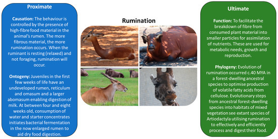 Applying Tinbergen’s Four Questions to a specific state behaviour for a taxonomic group. In this case, the initial happens (Proximate, immediate) and end result (Ultimate, adaptive significance) of rumination (“chewing the cud”) in ruminant (Artiodactyla) herbivores are shown. Four species of Artiodactyla are illustrated; Dama gazelle (Nanger dama), Congo buffalo (Syncerus caffer nanus), common eland (Tragelaphus oryx), and giraffe (Giraffa camelopardalis). Each species has a different ecology (some grazers, some browsers, some intermediate feeders) and focuses on a specific foraging niche, yet all ruminate for the same end goal. Radiation from a common ancestor, that evolved a symbiotic relationship with gut microflora to digest cellulose, has meant that extant ruminant species have diversified in morphology to enable collection of different forms of vegetation in different habitats around the globe.
