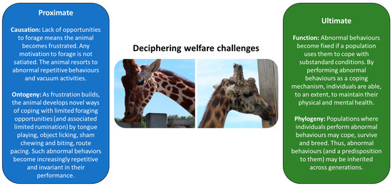 Application of TFQs is of particular importance when studying non-domestic species in the zoo to enable benchmarks for behavioural “normality” (i.e., performance of appropriate, species-specific actions within a daily time budget) to be defined. Such an approach would bring multiple benefits to understudied species in the zoo that require more research attention to help improve husbandry and welfare [65]. Multiple methodologies are used to explore behavioural ecology questions in wild species. However, external constraints placed on captive wild animals can impact the adaptive function of their behaviour, potentially causing deviation (in time, repertoire, or mechanics of the activity) from what has been observed in free-living individuals. For example, food presentation that inhibits natural foraging activity in captive African elephants (Loxodonta africana) also impedes the development of associated important mechanical behaviours, including gripping and manipulation [66]. This necessitates the need to apply a framework (such as TFQs) to analyse the causative agents of behavioural repertoires in captive animals, ultimately leading to better interpretation and assessment of the biological relevance of the behaviour (and what may happen when it is not performed in full or at all). Observing and evaluating how deviations from natural behaviour performance can result in welfare compromise (Figure 2) is an advantage of using TFQs within applied behaviour questions. And whilst this has been conducted for some taxa [11], we encourage a wider application across different species under human care.