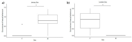 Differences in sexual behaviours between the sexes at different zoos analysed using a two-way ANOVA: (a) at Jersey Zoo, males exhibited more sexual behaviours than females; (b) at London Zoo, females exhibited more sexual behaviours than males. The asterisk (*) indicates p value smaller than 0.05 (p < 0.05). The point (˙) indicates an outlier.