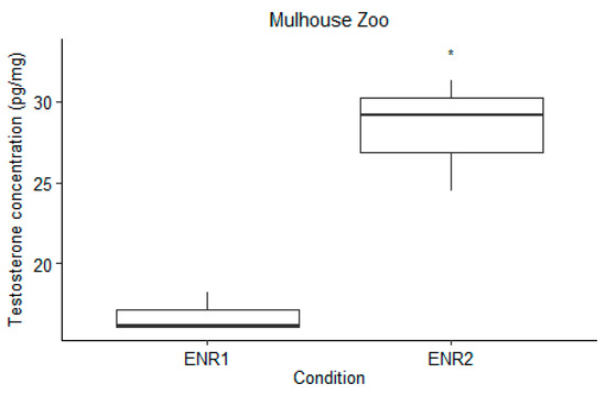 Results of the t-test analysis comparing male testosterone concentrations at Mulhouse Zoo during ENR1 and ENR2. The asterisk (*) indicates p value smaller than 0.05 (p < 0.05).
