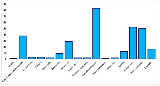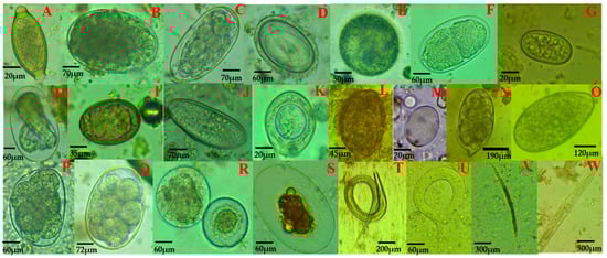- Eke, S.S.; Omalu, I.C.J.; Ochaguba, J.E.; Urama, A.C.; Hassan, S.C.; Otuu, C.A.; Okafor, I.D. Prevalence of gastrointestinal parasites of sheep and goats slaughtered in Minna Modern Abattoir, Niger State, Nigeria. J. Anim. Sci. Vet. Med. 2019, 4, 65–70. [Google Scholar] [CrossRef]