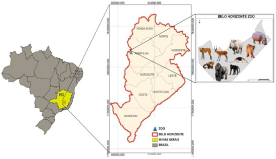 This study was conducted at the Belo Horizonte Municipal Parks and Zoo-Botanical Foundation (FPMZB), a 10.7-million-square-meter complex that houses more than 3500 individuals across 235 species, including 36 mammal species with 117 individuals. Notably, more than 40 species spanning reptiles, birds, fish, amphibians and mammals from all continents are threatened with extinction. Located in Belo Horizonte, Minas Gerais (−19.857889841, −44.0075113912) (Figure 1), the Zoo features a veterinary hospital and a rich history of biodiversity preservation. Established through Decree 16,684 of 31 August 2017, the FPMZB merged the former Municipal Parks Foundations and the Zoo-Botanical Foundation, playing a vital role in conserving local ecosystems and researching mammal species. Its parks and botanical gardens harbor more than a thousand species, representing Brazil’s Cerrado and Atlantic Forest biomes [17].