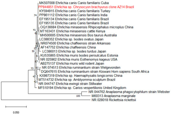 Phylogenetic tree based on an alignment of 630 bp of the Ehrlichia spp. 16S rRNA gene involving 25 nucleotide sequences, using the maximum likelihood method and K2 + G as an evolutionary model. The numbers at the branch nodes of the tree indicate bootstrap values from 1000 replications. The scale bar represents the evolutionary distance. The sequences detected in the present study are highlighted in red, with accession numbers provided in parentheses. A. marginale, A. phagocytophilum and Rickettsia rickettsii were used as outgroups.
