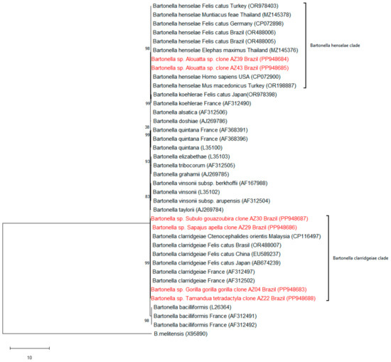ITS phylogenetic analysis grouped B. clarridgeiae sequences from cats and fleas with our sequences from gorillas, southern tamanduas, capuchin monkeys and brocket deer. Conversely, B. henselae sequences from cats, deer, rodents and humans clustered with our sequences from howler monkeys. These findings expand the known host range for B. clarridgeiae and B. henselae, suggesting potential underestimation of their prevalence in captive animals [29]. Despite the small sequences used for constructing the phylogeny, it was possible to distinguish between the species. The ITS gene, a noncoding region of ribosomal DNA, varies between Bartonella species, enabling their molecular differentiation [76].