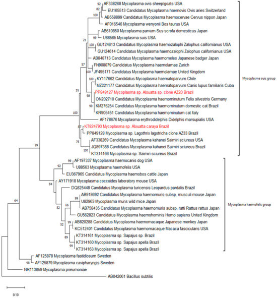 Phylogenetic tree based on an alignment of 600 bp of Mycoplasma spp. 16S rRNA gene involving 41 nucleotide sequences, using the ML method and GTR + G as an evolutionary model. The numbers at the branch nodes of the tree indicate bootstrap values from 1000 replications. The scale bar represents the evolutionary distance. The sequences detected in the present study are highlighted in red, with accession numbers provided in parentheses. Mycoplasma pneumoniae and Bacillus subtilis were used as outgroups.