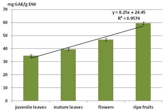 The total content of phenolic compounds was highest in the mature fruits: 59.5 mg GAE/g DW expressed as gallic acid; this is 1.3 to 1.6 times higher than in other plant organs (Figure 3). Significant differences were recorded between the various plant organs for this parameter: R2 = 0.96.