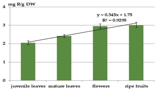 The total flavonoid content was also highest in the mature fruits of A. fruticose, i.e., 3.02 mg/g DW of rutin, which is 1.3 to 1.5 times higher than in the leaves (Figure 4). Notably, the total flavonoid content in the flowers was similar to that in the fruits, unlike the total phenolic content. Significant differences were observed between the various plant organs for this parameter: R2 = 0.93. The flavonoid content in individual organs constitutes 5.1–6.2% of the total polyphenols.