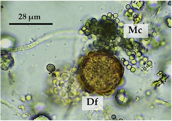 With the aim of analyzing the antagonistic effect against roundworm eggs, a modified sedimentation technique [] was used in trial 1, consisting of directly taking the content of each tray and emulsifying it into 1 L water. After completely mixing, the contents were sequentially passed through sieves with different pore diameters (4, 0.52, 0.15, and 0.050 mm) to reduce the presence of coarse particles. The resulting liquid was deposited in sedimentation cups for 24 h. Finally, the sediment obtained was analyzed under a microscope by placing 50 μL aliquots between glass slides and coverslips []. A similar procedure was applied to trial 2 by taking half of each soil sample delimited by the wooden frames (ca. 30 × 20 cm and 5 cm deep) and sinking it into 2 L water until entirely submerged. The blend was filtered along different sieves, as mentioned above, and the filtrate was placed into sedimentation cups for 24 h. After discarding the supernatant until 100 mL was obtained, the final volume was observed under a microscope, as mentioned before. Based on previous investigations, the eggs were sorted into non-viable and viable by considering the presence of eggshell damage or disruption [] (Figure 4).
