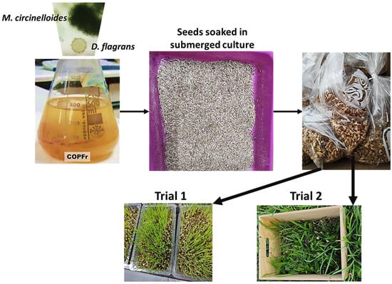 Study design conducted with forage seeds soaked in submerged culture containing chlamydospores of M. circinelloides (Mc) and D. flagrans (Df).