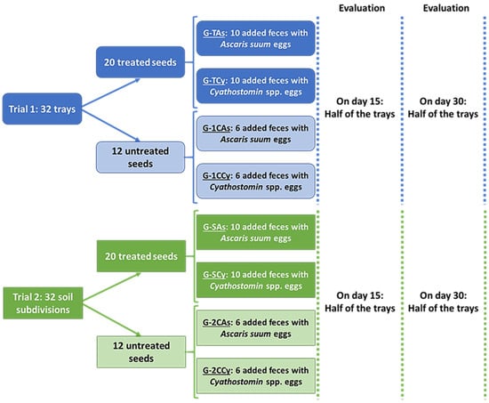 In trial 1, the preparation of the trays consisted of placing 200 g of compost autoclaved in each and then planting 50 g seeds. Accordingly, a total of 32 trays were prepared and maintained in the lab at RT (17–22 °C). Twelve trays were assigned untreated seeds (controls). Six of these trays received 12 g of feces from piglets, shedding 3450 eggs of Ascaris suum per gram of feces (EPG). The other six trays received 12 g of feces from horses, shedding 685 cyathostomin EPG. Twenty trays were sown with pre-treated seeds (Figure 3) and then sorted into two groups of 10 each. The group of G-TAs received 12 g of feces from piglets, shedding 3450 A. suum EPG, and the G-TCy group received 12 g of feces from horses, shedding 685 cyathostomin EPG. In each group, half of the trays were analyzed 15 days later, and the remainder was analyzed at the end of the assay (day 30).