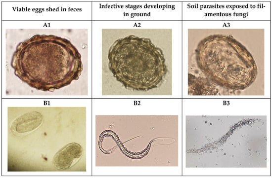 Eggs of certain helminths like Ascaris sum (A1) or strongylid nematodes (B1) are shed in the feces of infected animals and, once in the ground, evolve to reach the infective stage; eggs containing an L2 inside (A2) or third-stage larvae (B2). The antagonistic activity of the fungi causes the non-viability of eggs (A3) and L3 larvae (B3).