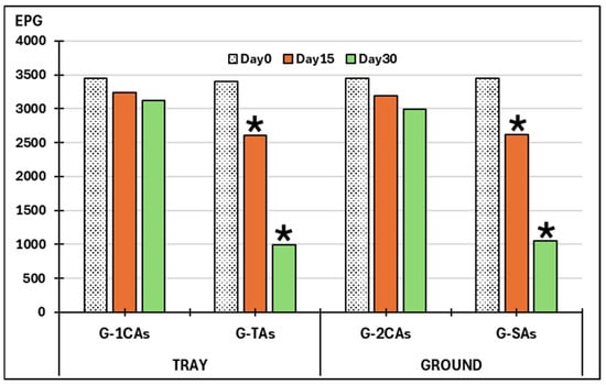 Variations in the viability of eggs of Ascaris suum. G-1CAs: control group trays (seeds without fungi); G-TAs: trays sown with seeds soaked in submerged culture containing M. circinelloides and D. flagrans; G-2CAs: control soil parcels (without fungi). G-SAs: soil parcels sown with seeds pre-soaked in submerged culture containing M. circinelloides and D. flagrans. EPG: eggs of A. suum per gram of feces; (*): significant differences.