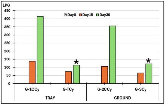 Variations on the viability of L3 larvae of cyathostomins. G-1CCy: control group trays (seeds without fungi); G-TCy: trays sown with seeds soaked in submerged culture containing M. circinelloides and D. flagrans: G-2CCy: control soil parcels (without fungi); G-SCy: soil parcels sown with seeds soaked in submerged culture containing M. circinelloides and D. flagrans. LPG: L3 larvae of cyathostomins per gram of feces; (*): significant differences.