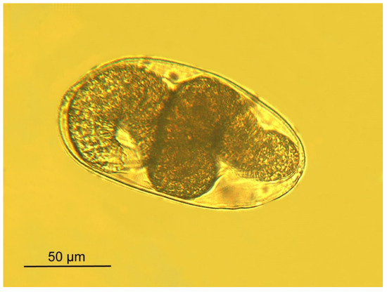 Eggs in faeces (24–48 h after faecal collection) have the following characteristics: elliptical shape and blunt ends; are 139–169 (151.7 ± 9.60) µm long; 71–82 (78.1 ± 3.60) µm wide; contain a developed enbrio; and are covered with a double-layered shell. Larvae in the eggs are large, transversely striated, and some have a distinguishable shell (Figure 1).