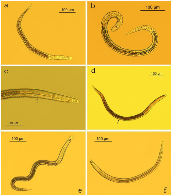 Third-stage Rugopharynx australis larvae found in the faeces of Osphranter rufus from Sofia Zoo, Bulgaria: (a,b) On the 8th day of faecal collection. (c) On the 16th day of faecal collection; arrow—excretory pore. (d) On the 16th day of faecal collection; arrow—genital primordium. (e) On the 30th day of faecal collection. (f) On the 88th day of faecal collection. Original pictures.