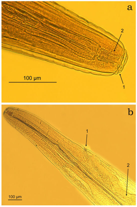 Anterior end of adult worms of Rugopharynx australis found in the faeces of Osphranter rufus from Sofia Zoo, Bulgaria. (a) 1—papillae around the mouth opening, 2—pharynx. (b) 1—excretory pore, 2—bulbous dilation at the posterior end of the oesophagus. Original pictures.