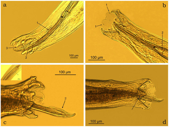 Posterior body end of the male Rugopharynx australis, found in the faeces of Osphranter rufus from Sofia Zoo, Bulgaria. (a) Lateral view, 1—gubernaculum, 2—ventral rays of the copulatory bursa, 3—lateral rays of the copulatory bursa. (b) Dorsoventral view, 1—dorsal ray of the copulatory bursa, 2—heart-shaped chitinised structure. (c) Spicules, 1—proximal parts, 2—distal parts. (d) Arrow—genital cone. Original pictures.
