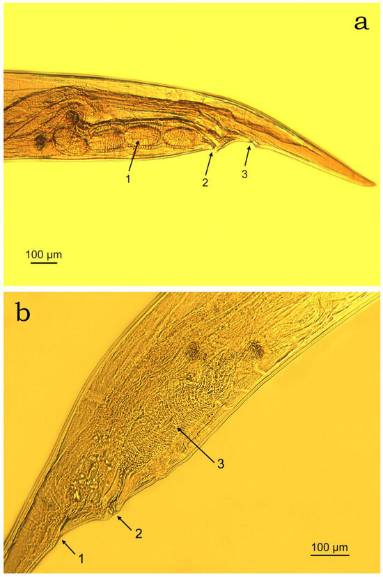 Posterior body end of the female Rugopharynx australis, found in the faeces of Osphranter rufus from Sofia Zoo, Bulgaria. (a) 1—vagina with eggs, 2—vulva, 3—anus. (b) 1—anus, 2—vulva, 3—vagina/ovijector. Original pictures.