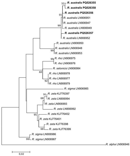 Phylogenetic analysis of the partial SSU, complete ITS1, complete 5.8 S rRNA, complete ITS2, and partial LSU sequence data with R. alpha as the outgroup revealed six strongly supported clades (Figure 6). One clade contained R. australis, the second clade contained the taxa R. rho and R. setonicis, the third clade contained a single isolate of R. sigma, the fifth clade contained R. zeta, the sixth clade contained two isolates of R. sigma, and the seventh clade contained R. alpha. The first clade contains two subclades containing R. australis taxa. The sequences obtained in this study co-created the first subclade of R. australis taxa.