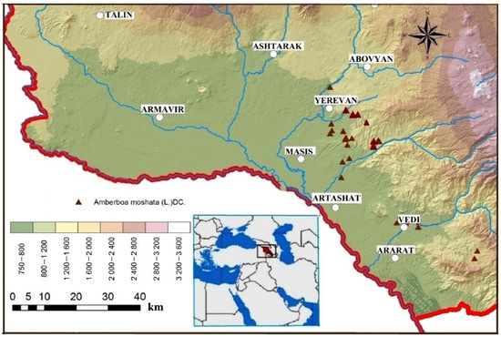 This study is focused on the xerophytic ornamental species Amberboa moschata (L.) DC. (Asteraceae). Genus Amberboa (Pers.) Less. includes 12 species distributed in Southwest, Middle, and Central Asia, of which 8 species occur in the Caucasus [1,2]. Wild populations of A. moschata are native only to the Ararat Valley of Armenia, and adjacent areas in Northeast Anatolia [1]. In Armenia, A. moschata grows in the Yerevan floristic region at an altitude of 600–1500 m above sea level: in dry clayey, gypsum-bearing deserts; in wormwood semi-deserts; on gravelly, rocky places; and in crops (Figure 1). It is found in the Ararat Valley xeromorphic gypsiferous red and gravelly clay communities with such species as annuals Actinolema macrolema Boiss., Halanthium rarifolium K. Koch, Szovitsia callicarpa Fisch. & C.A. Mey., perennials Dorema glabrum Fisch. & C.A. Mey., Haplophyllum villosum (M. Bieb.) G.Don, Psephellus erivanensis Lipsky, Rindera lanata (Lam.) Bunge, subshrubs Kaviria cana (K.Koch) Akhani, K. tomentosa (Moq.) Akhani, Salvia hydrangea DC. ex Benth., and others. A. moschata is included in the Red Book of Plants of the Republic of Armenia under the Endangered Species category (EN) based on geographic condition criteria B 1 ab(i,ii,iii) + 2 ab(i,ii,iii) [3]. Limiting factors posing a threat to the species are restricted extent of occurrence and area of occupancy, loss or degradation of natural habitats caused by land development for agricultural crops, and the expansion of human settlements. The collection of A. moschata in the wild for use in flower bouquets has increased significantly, which also has a negative impact on the status of the species [4]. A part of the A. moschata population is protected in the Erebuni State Reserve of RA. Degradation of habitats and reduction in the range and population size of A. moschata necessitates measures to conserve this species not only in the wild, but also outside its natural habitats under ex situ conditions.
